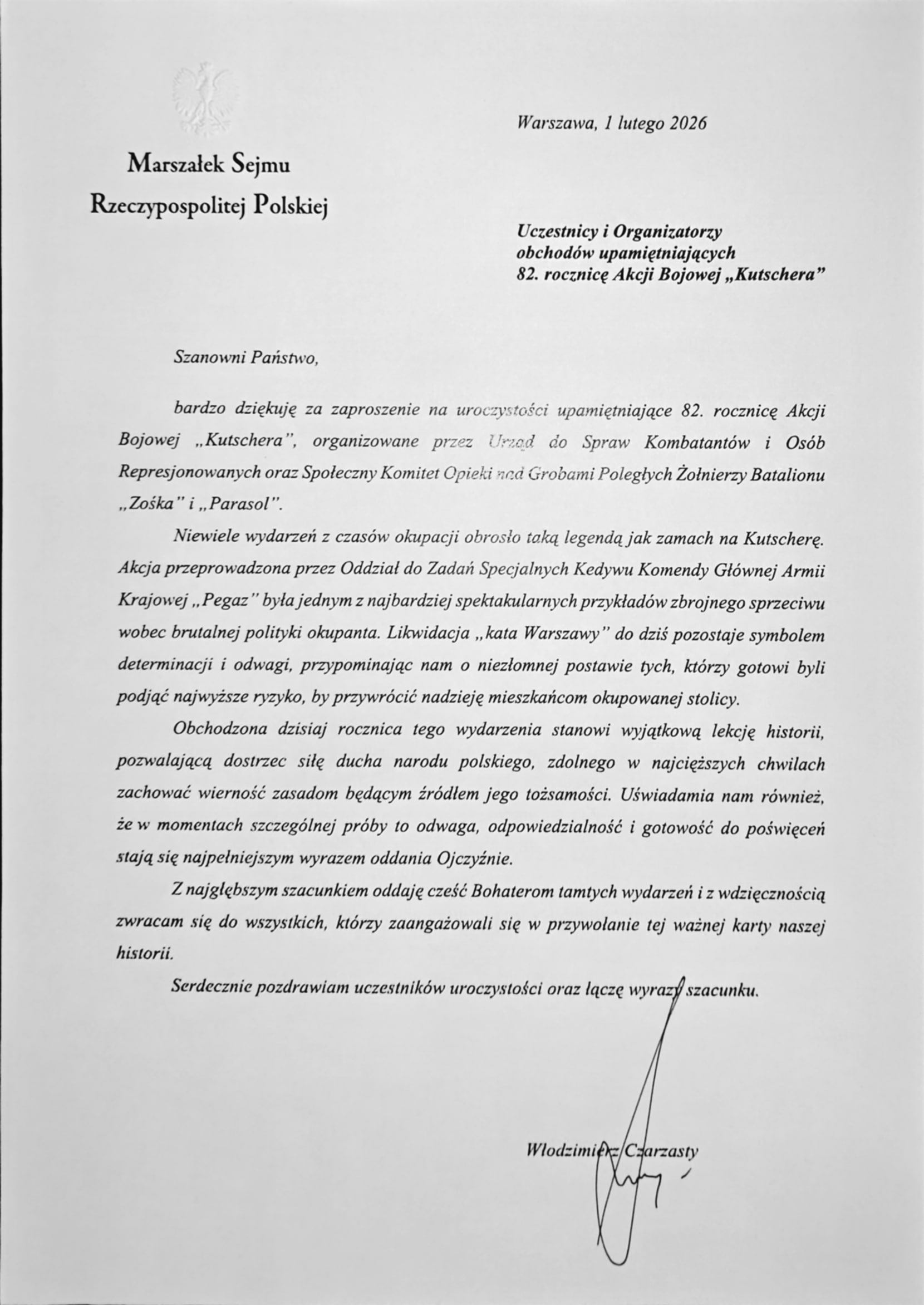 Do organizatorów wpłynęły także okolicznościowe listy od Prezydenta RP oraz Marszałka Sejmu. Ich treść znajduje się poniżej.